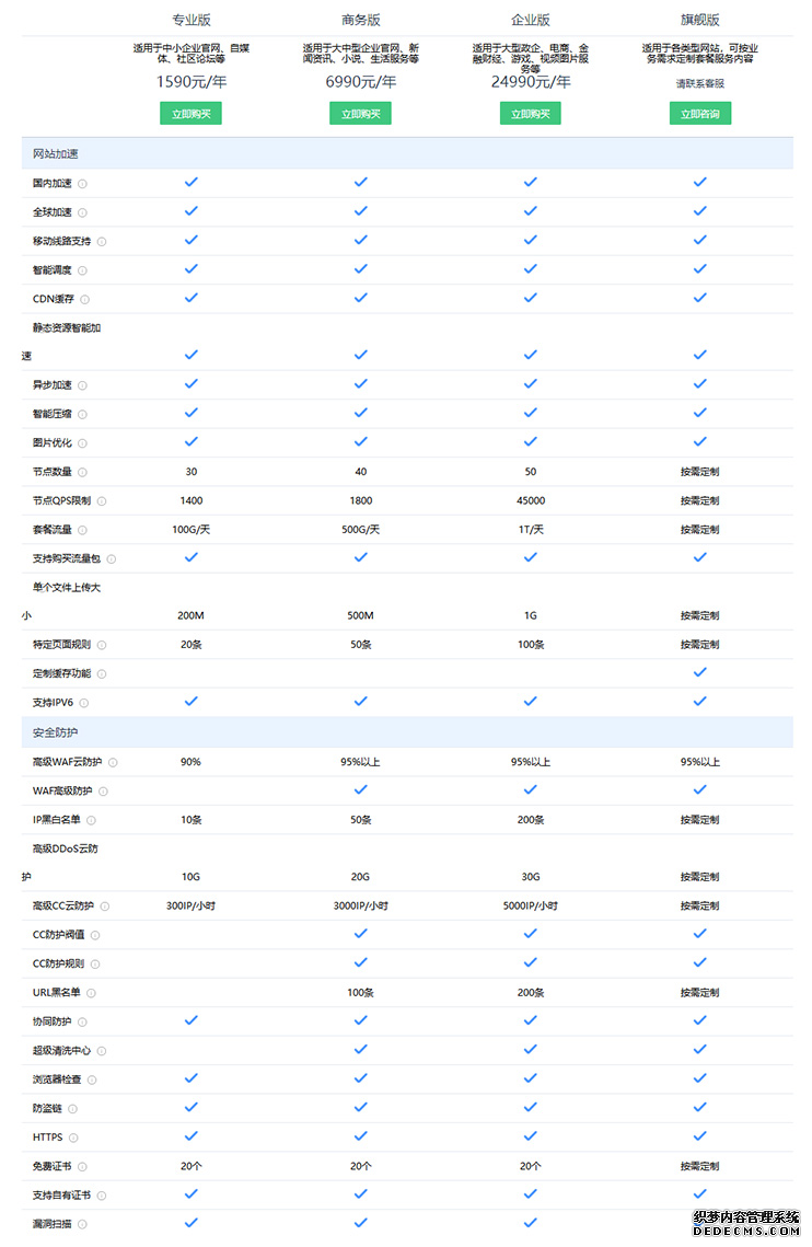 | 企業(yè)版 | 電商、金融、企業(yè)站 | 50個 | 1T/天 | 30W QPS | 30G | 100條/天 | 7 x 24專屬客服 | 99.9% | 24990/年 |