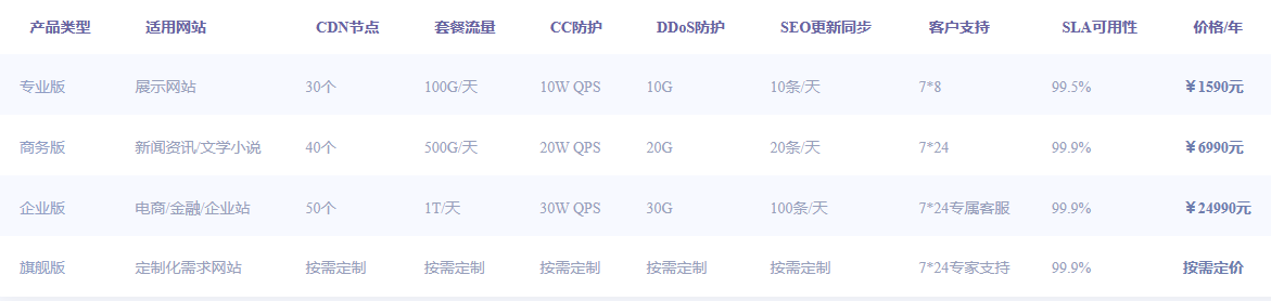 | 產(chǎn)品類型 | 適用網(wǎng)站 | CDN節(jié)點(diǎn) | 套餐流量 | CC防護(hù) | DDoS防護(hù) | SEO更新同步 | 客戶支持 | SLA可用性 | 價(jià)格 |
